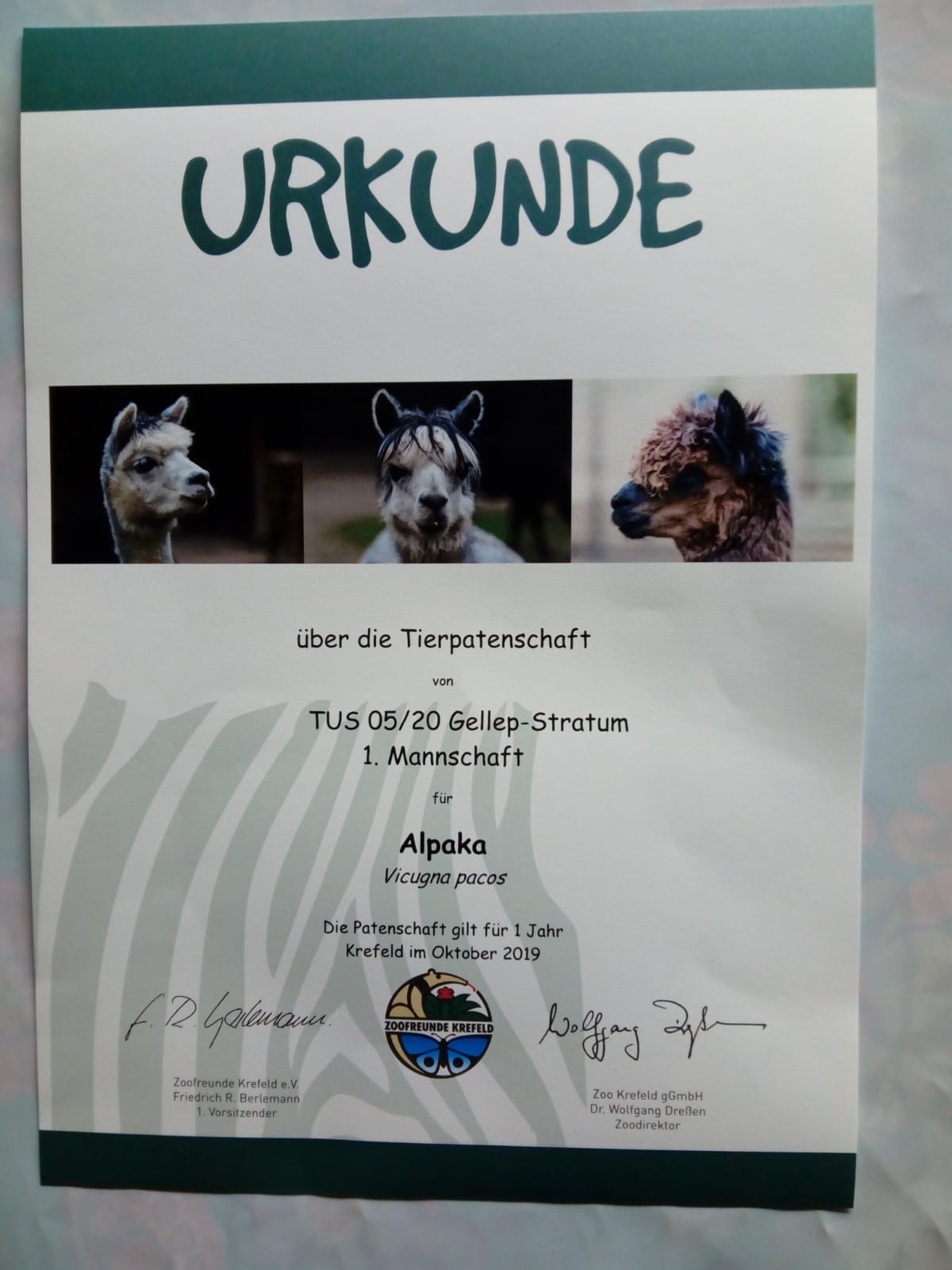 Dass unsere 1. nicht nur im sportlichen Bereich unterwegs ist, hat sie jetzt wieder bewiesen, als sie nun eine Patenschaft für ein Alpaka im Krefelder Zoo übernommen hat. Und was zeichnet Alpakas aus? Sie sind sehr freundliche und gutmütige Wesen, intelligent, neugierig und liebevoll. Allerdings sind sie auch durchaus wehrhaft. Alpakas sind ausgesprochen anpassungsfähige und robuste Tiere. Sie sind Herdentiere mit einem ausgeprägten Sozialverhalten. Deshalb dürfen diese Tiere nie alleine gehalten werden. Sie benötigen ganzjährig genügend Weide- und Auslauffläche. Das passt!!!