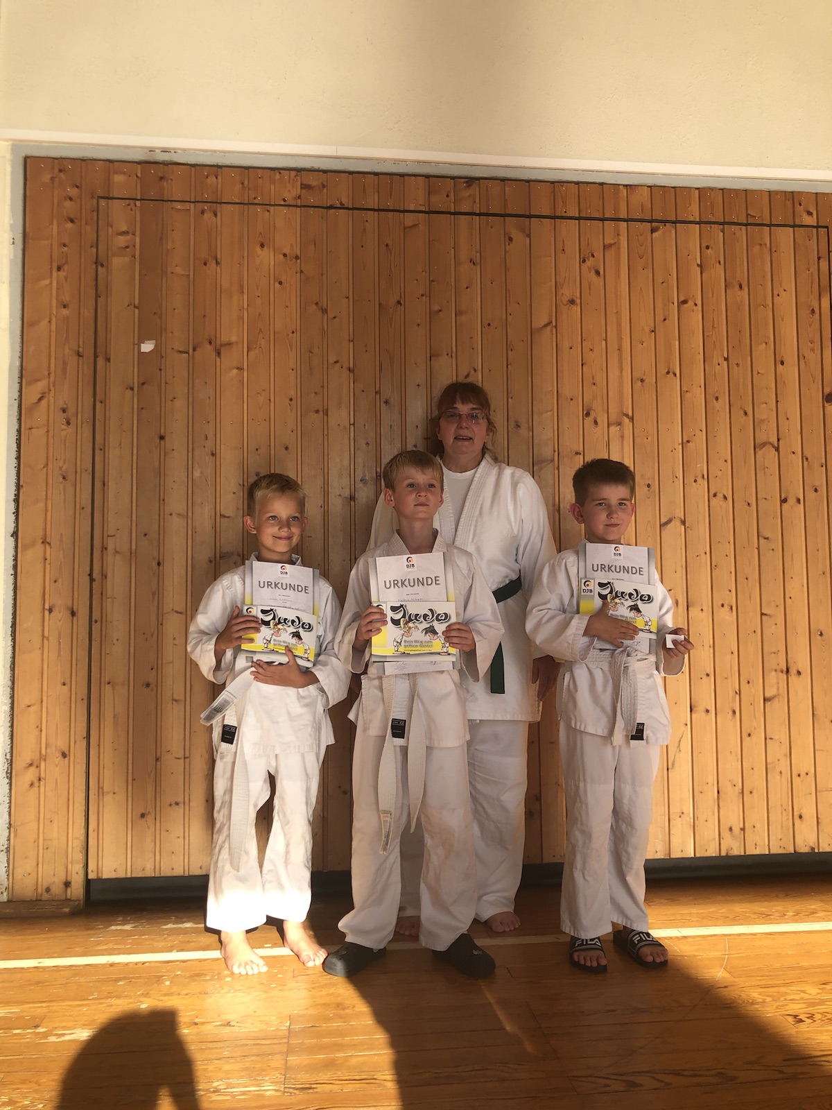 Am 28. August fand die erste Gürtelprüfung der neuen Judoka statt. Alle vier Teilnehmer (Julian, Jakob, Mattis und Tom) haben ihre erste Prüfung zum weiß-gelben Gürtel bestanden und erhielten von der Trainerin Monika Böhm die entsprechenden Urkunden. Herzlichen Glückwunsch an die neuen Gurtträger!