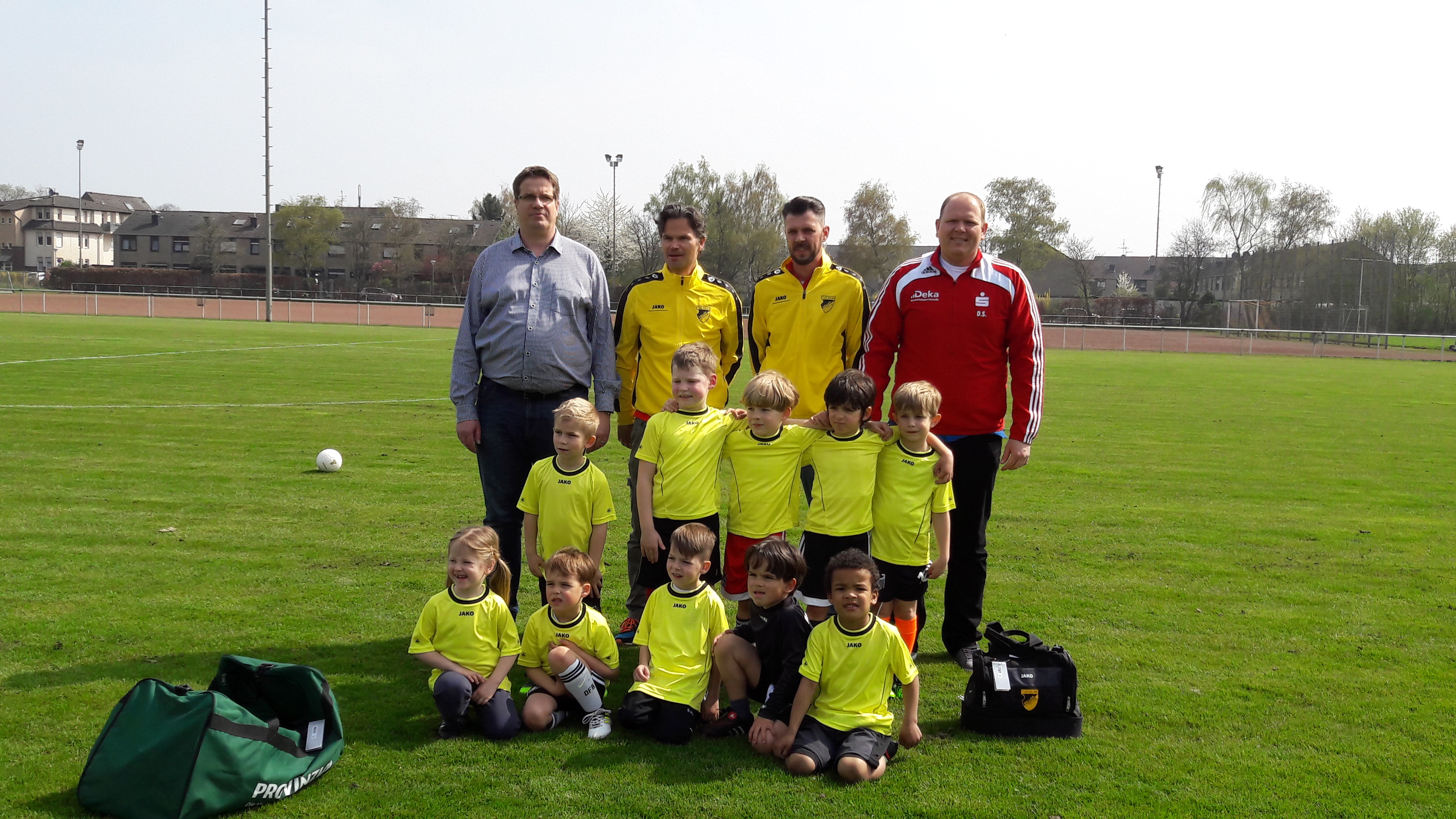 Große Augen machten unsere Bambinis als zu Beginn des Familiennachmittags die Trainer Marc und Daniel die Spieler versammelten und eine Überraschung ankündigten. Diese folgte dann in Form der neuen Ausrüstung (u.a. Traningsanzug, Tasche), die mit der Unterstützung der Sparkasse Krefeld den Kindern zur Verfügung gestellt werden konnte. Filialleiter Dirk Schumacher (oben rechts im Bild) freute sich mit unserem Nachwuchs. Herzlichen Dank!