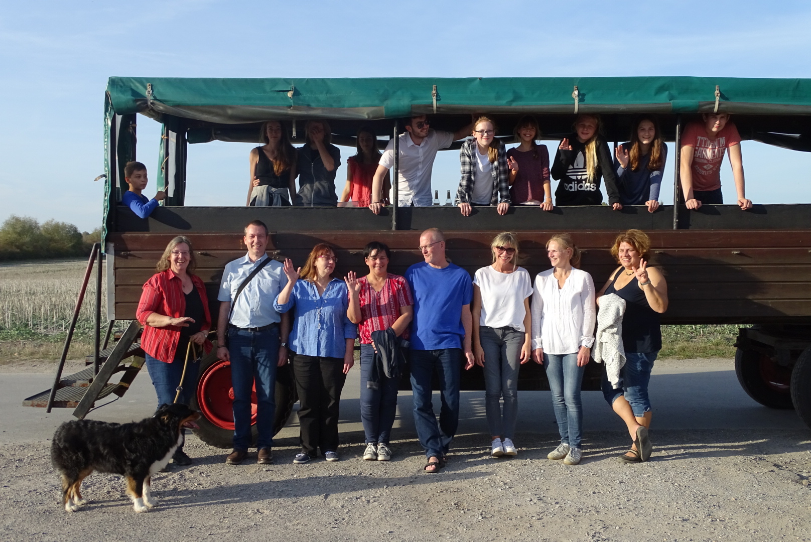 Wir sind am 12. Oktober um 15.00 Uhr an der Gaststätte „Zur Vreed „ bei strahlendem Sonnenschein und angenehmen Temperaturen mit dem Planwagen gestartet. Der Kutscher fuhr in gemächlichem Tempo durch Traar am Egelsberg vorbei bis zum Kirschkamper Hof. Dort stiegen unsere Nachzügler (arbeitende Eltern und Schüler mit Nachmittagsunterricht) zu. Nach einer Pause zum Beinevertreten ging es dann mit knapp 20 Teilnehmern unter nettem Geplauder, dem Verzehr leckerer mitgebrachter Snacks und mit viel Spaß durch Verberg zurück zur Vreed – Entschleunigung pur für 4 Stunden.